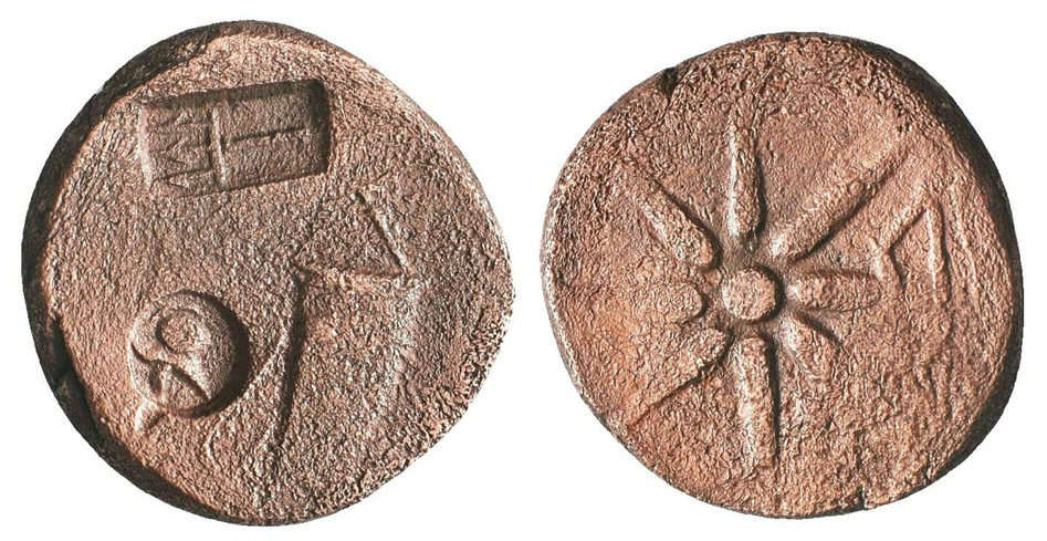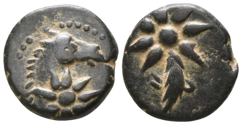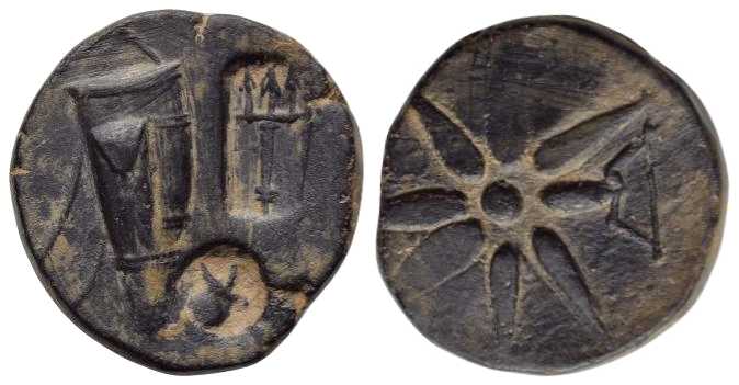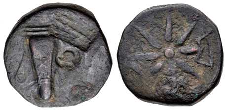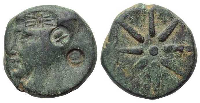 / Filleted Palm Branch AE 120-63 BC HGC VII ---; Stancomb ---; CNG 407E/161, 11.10.17 SHH v5448 2.20 g ≈13 mm centering -/- grooves -/- Zeus Num. 10/160, 12.7.2020 |